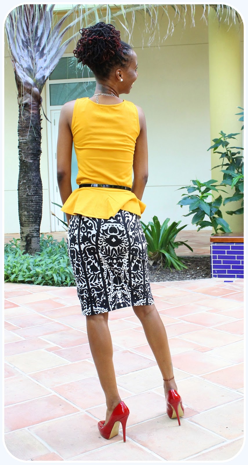 I wore this outfit to work yesterday so I guess I'm not too late in posting it. The skirt is actually a dress I flipped inside out and chose to wear as a skirt. I wore it as a dress in this post. I also figured that if I wore black shoes, the outfit would simply be blah so I added the red pumps for a pop of colour.